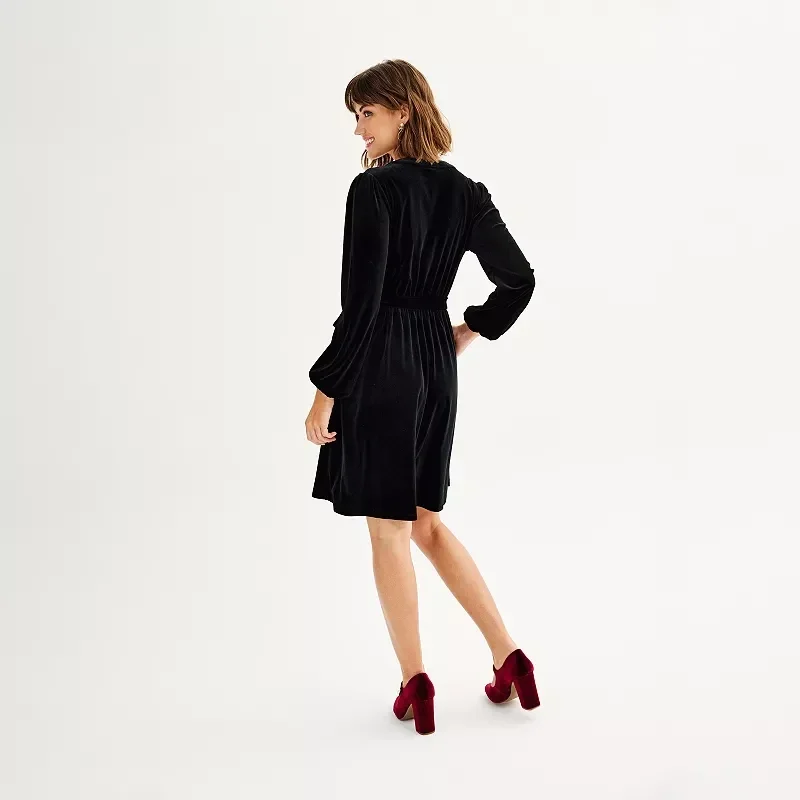 Color Wine. Breathe some life into your wardrobe with this cute women's belted velvet dress from Draper James. Velvet Construction, V-neck, two pockets, Bishop sleeves with elastic cuffs, coordinating sash, fully lined, no closure-pullover styling, fit & flare silhouette, mini length hits at the thigh, back elastic waistband, lininh polyester, machine wash delicate.