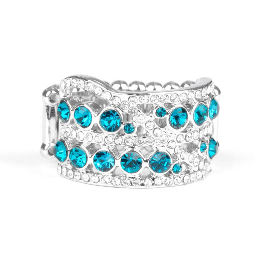 Glittery blue and glassy white rhinestones scatter across the finger, layering into a refined stacked centerpiece. Features a stretchy band for a flexible fit.
